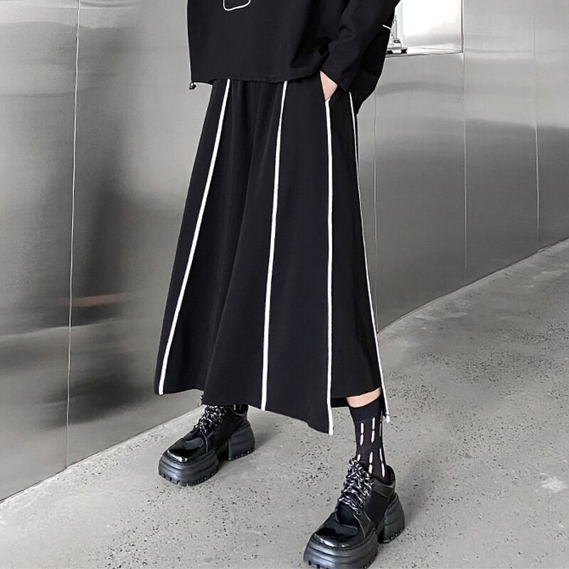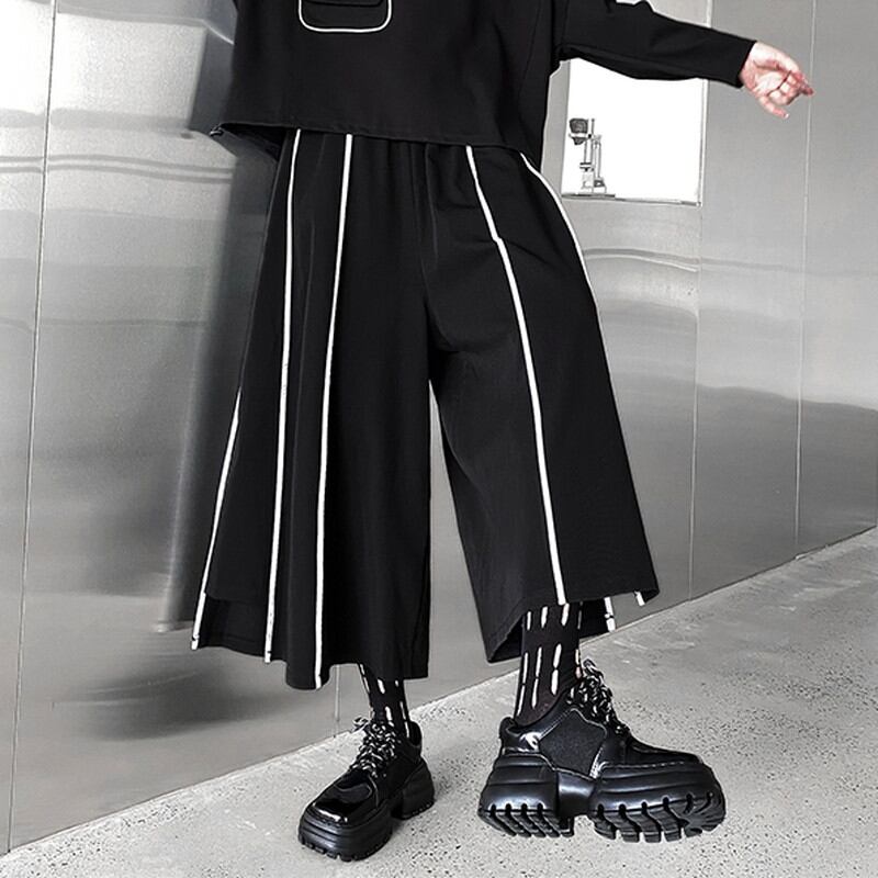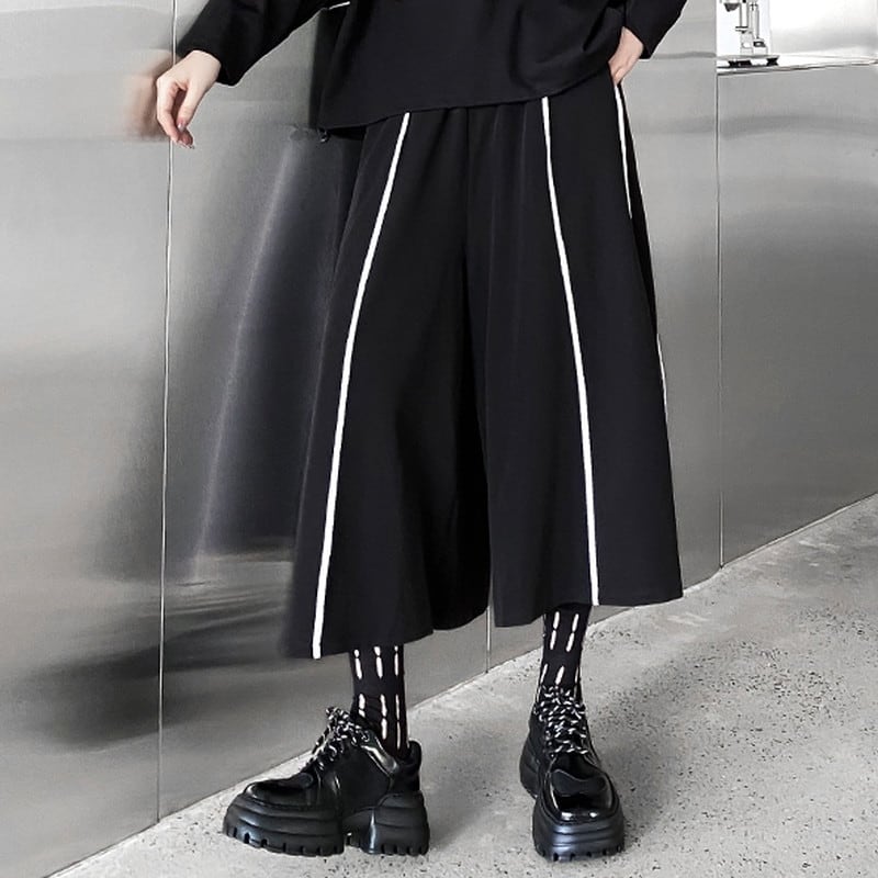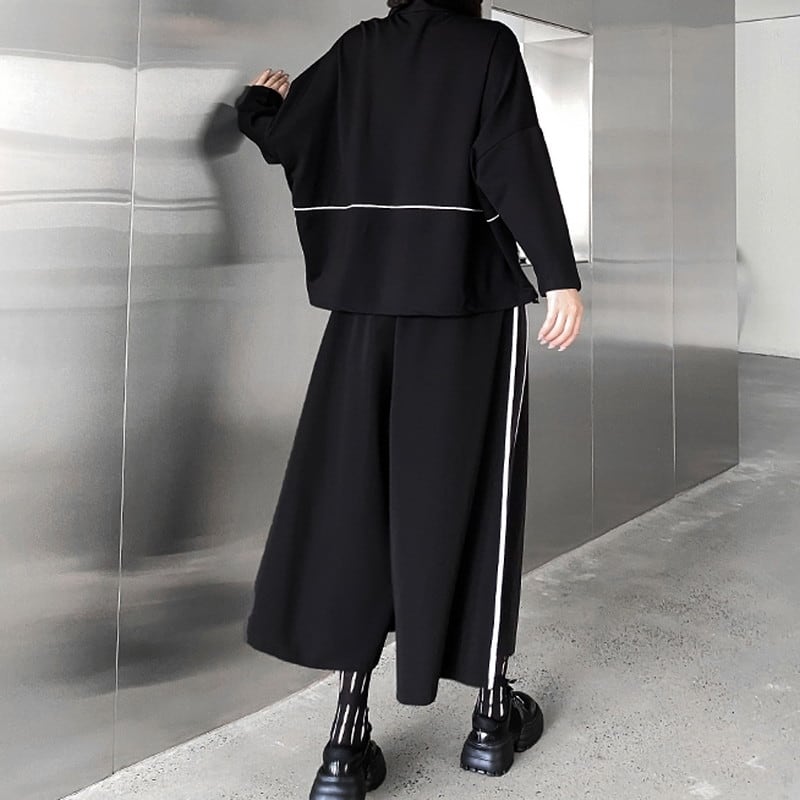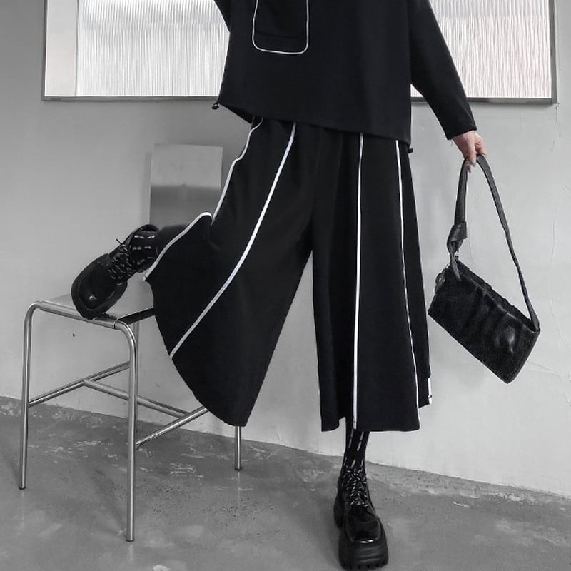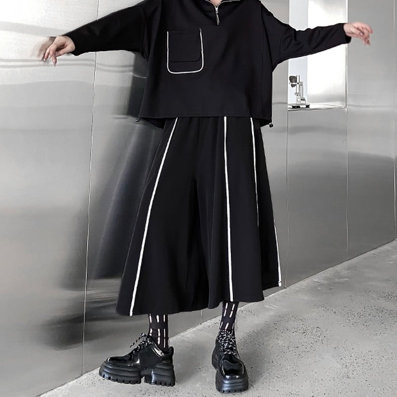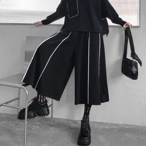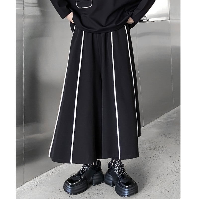 パイピングデザインのラインがアクセントになったワイドパンツ。