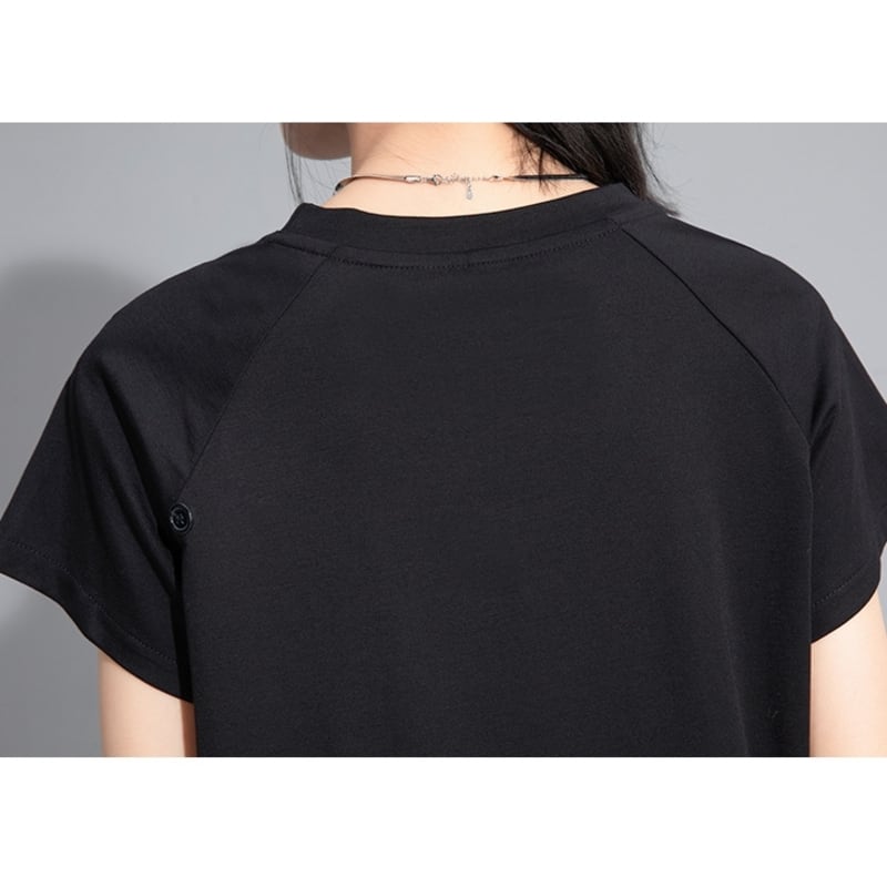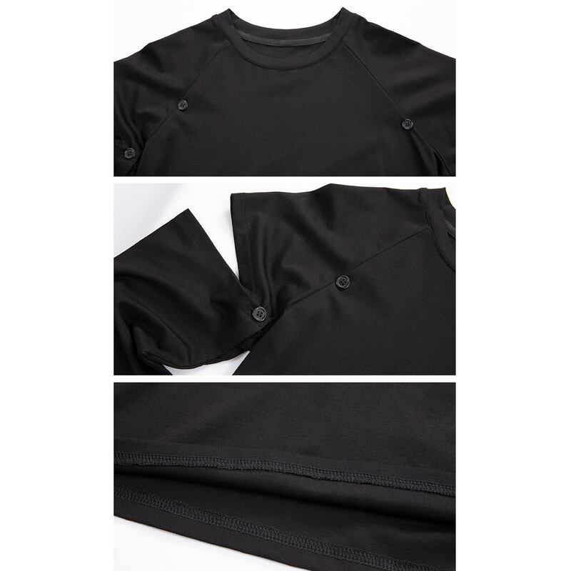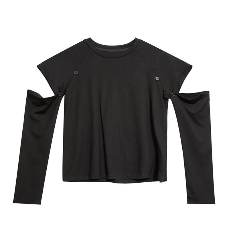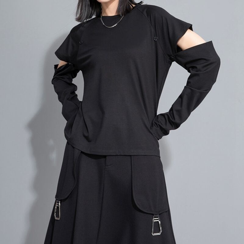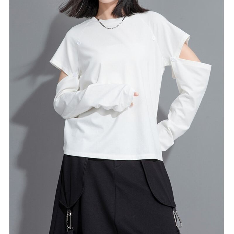 大胆なカットアウトデザインが個性を際立たせる長袖スタイル、アームホールを取り外せばシンプルな半袖スタイルに変身します。