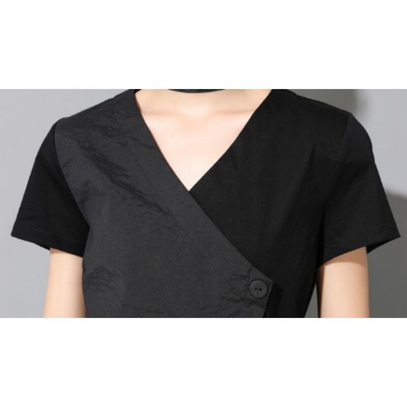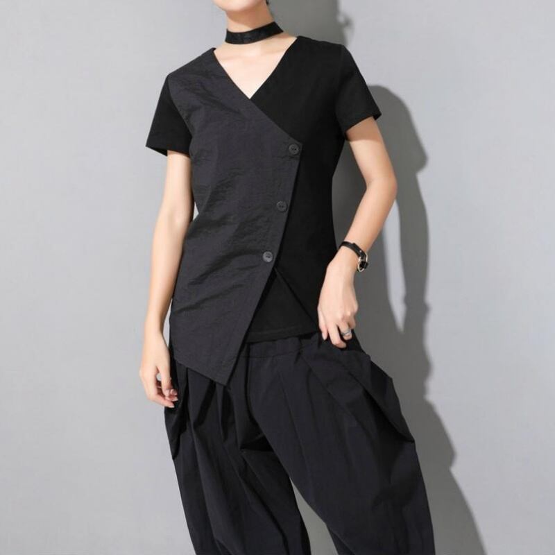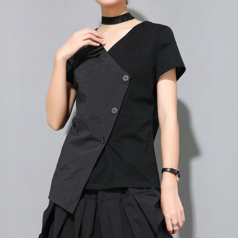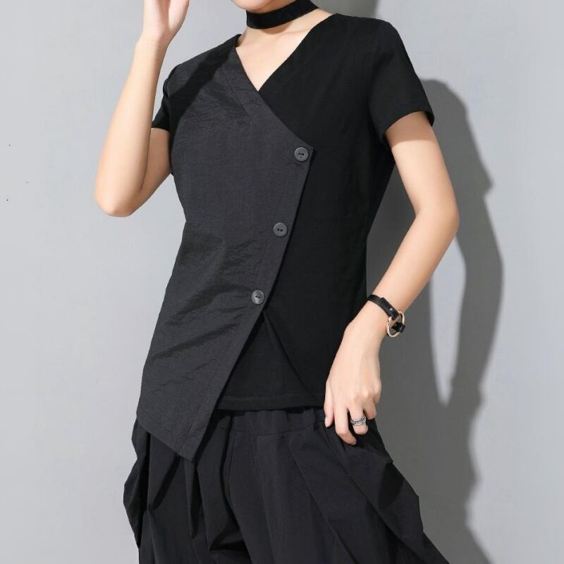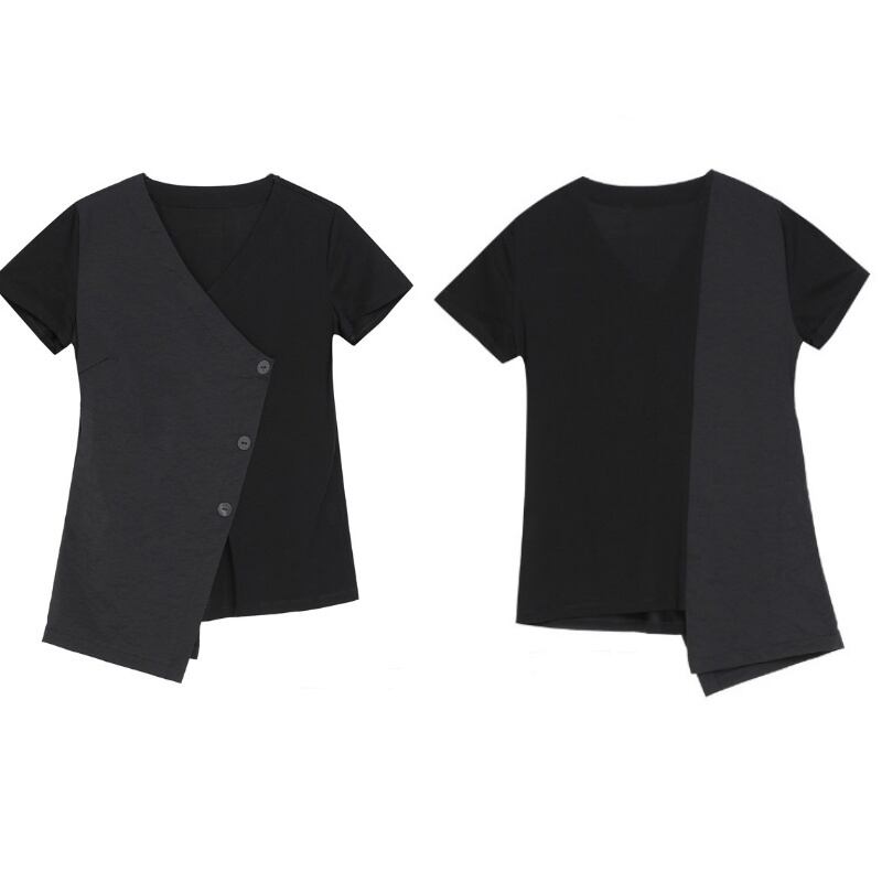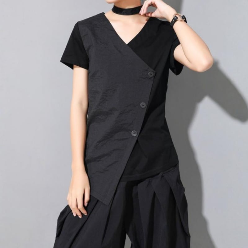 アシンメトリーなヘムラインとスラントしたフロントボタンが特徴的なVネックTシャツ。