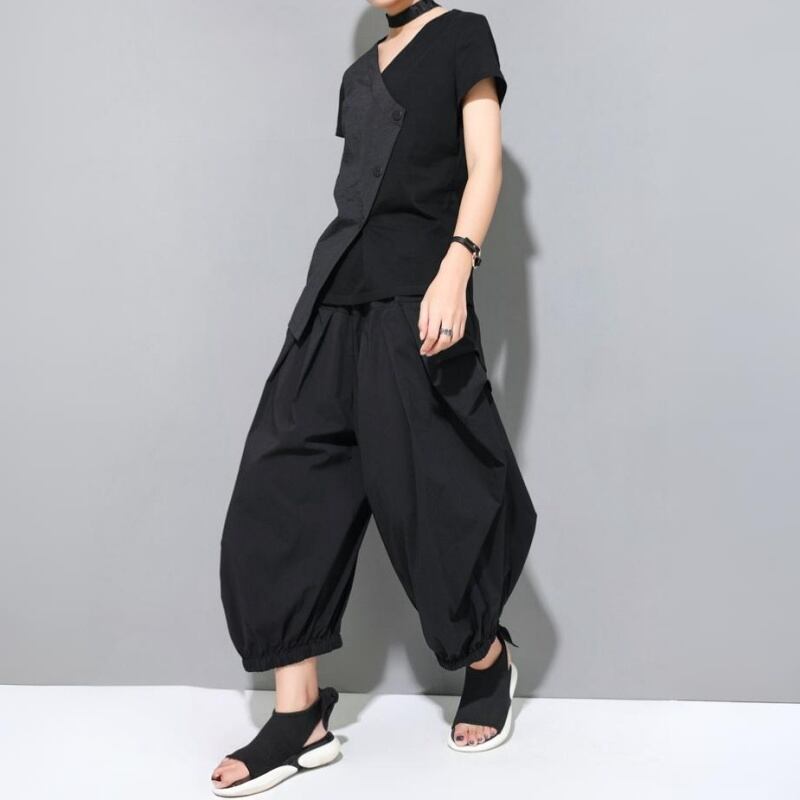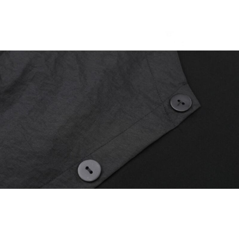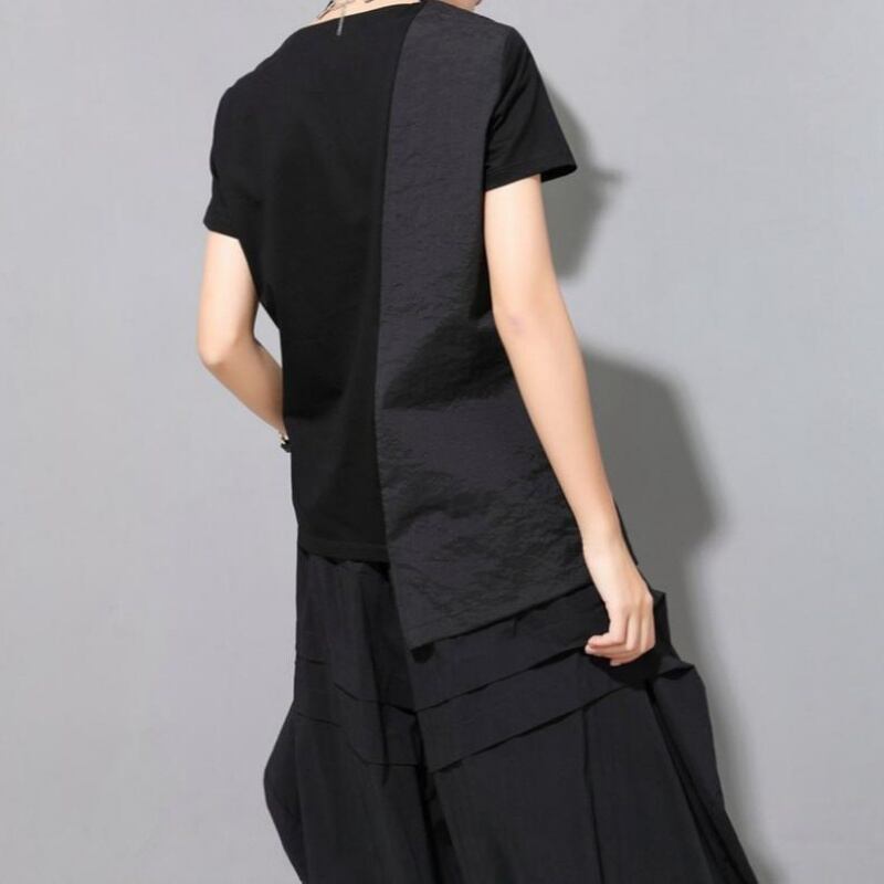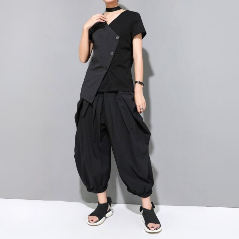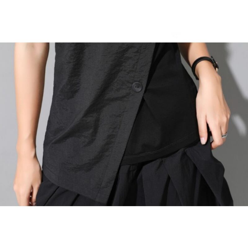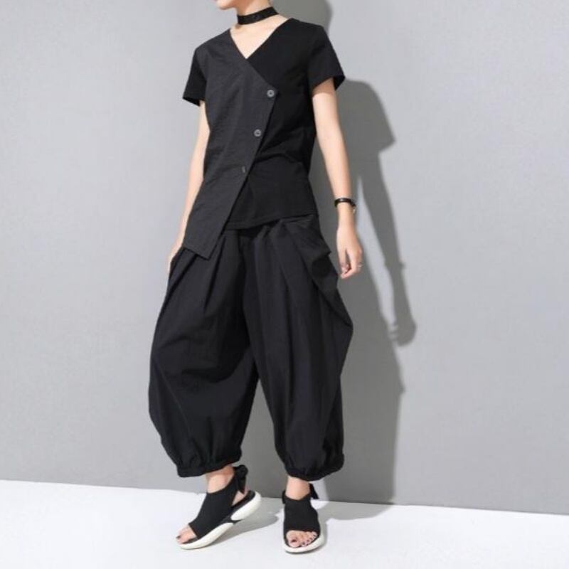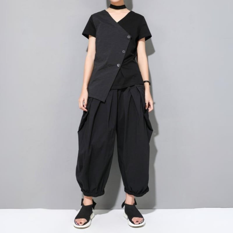 アシンメトリーなヘムラインとスラントしたフロントボタンが特徴的なVネックTシャツ。