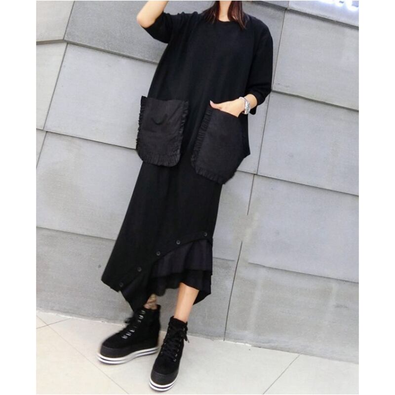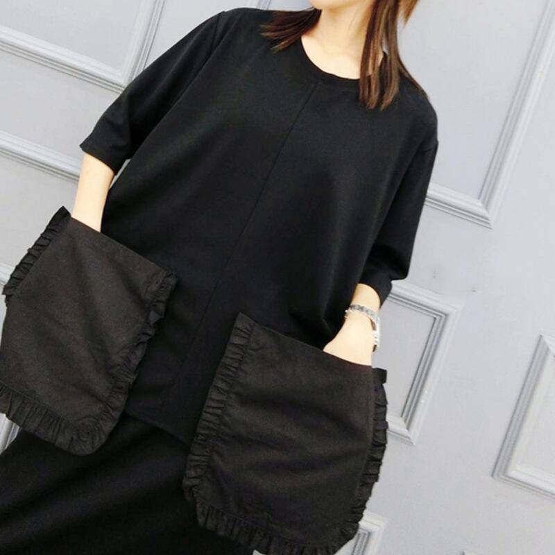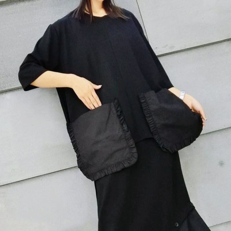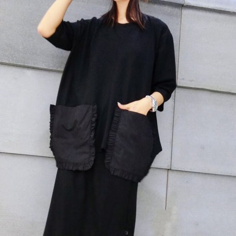 大きなフリル付きポケットが目を惹き、シンプルながらも個性的なスタイルを演出します。