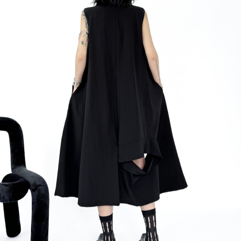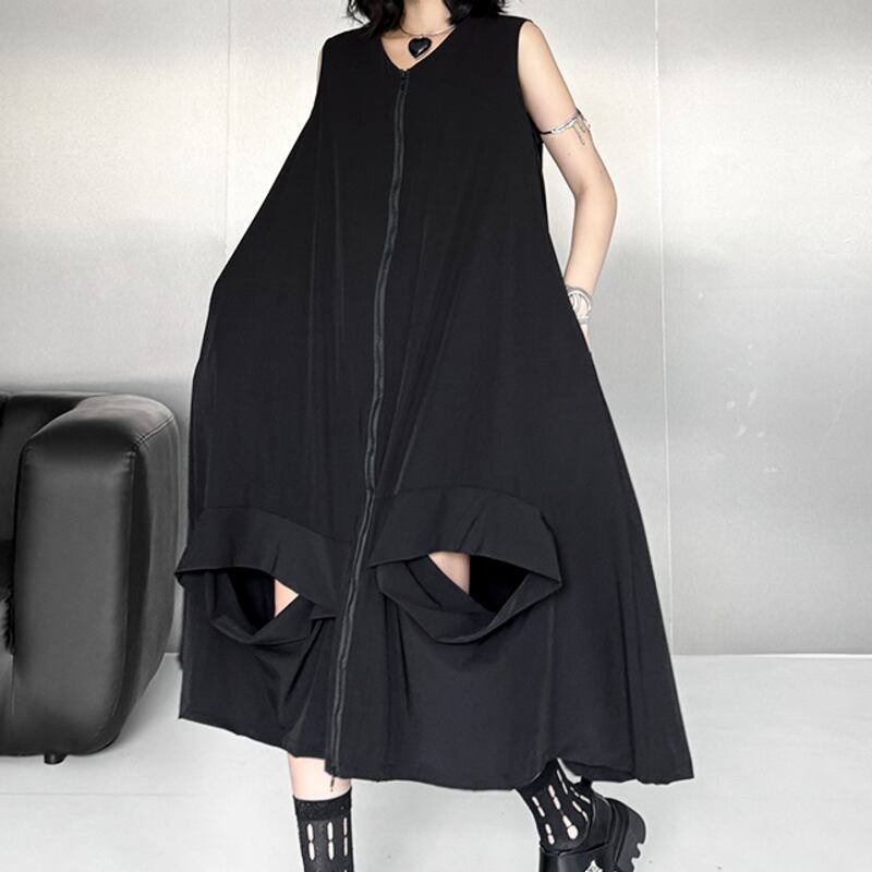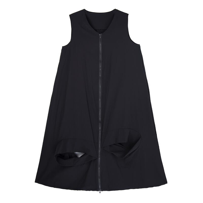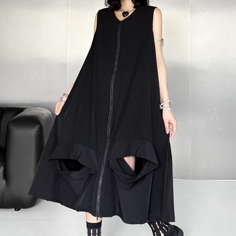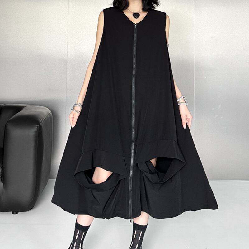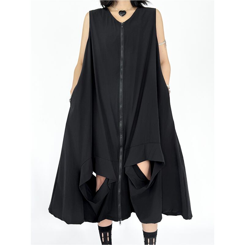 Aラインシルエットが女性らしい優しさを与えつつ、フロントジッパーと大胆なホールデザインがモードな雰囲気を醸し出します。