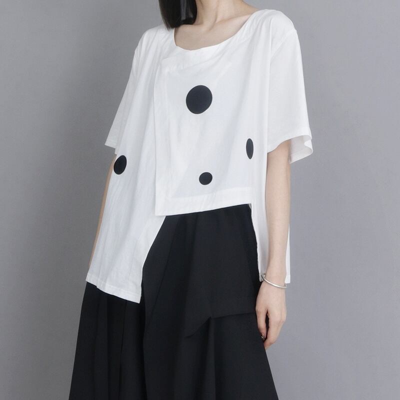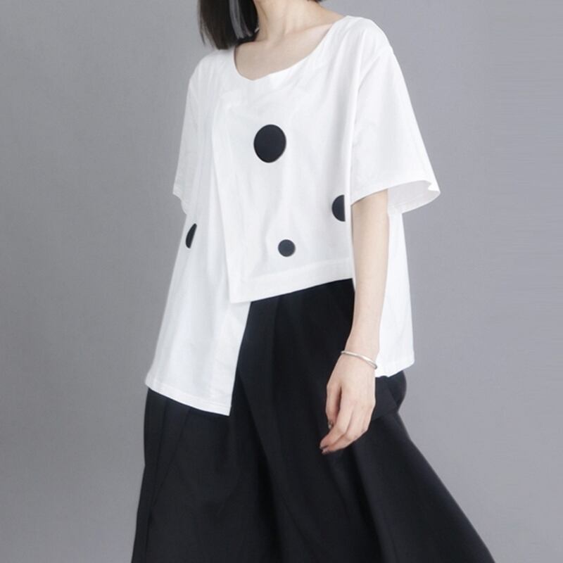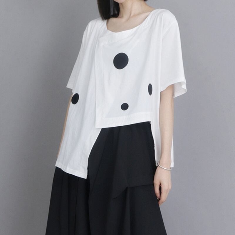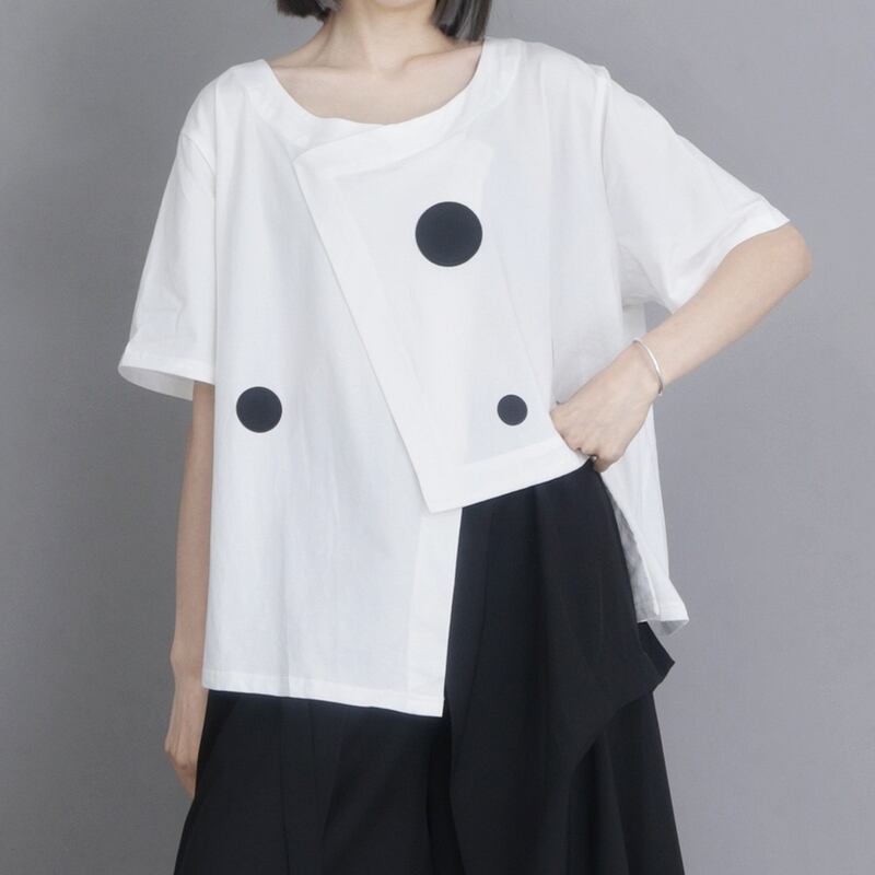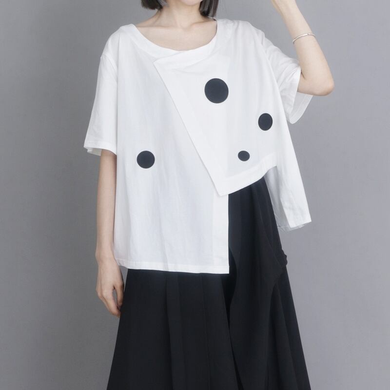 ドット柄のアシンメトリーデザインが目を惹く、オーバーサイズトップスは一枚でスタイリッシュな着こなしが完成します。
