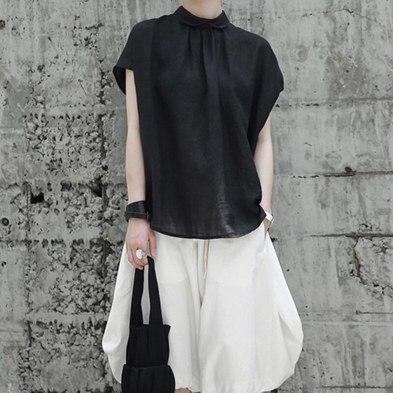 すっきりとしたスタンドカラーネックで、首元も美しく演出。