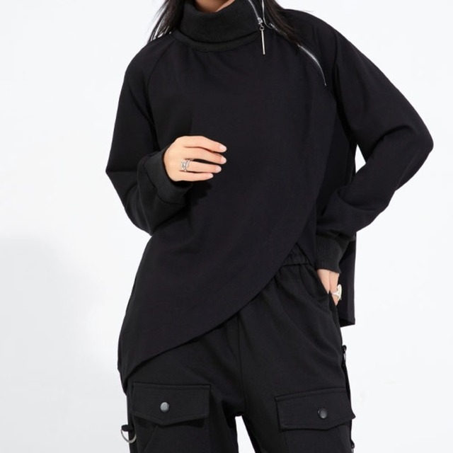 Vネックとラップデザインの組み合わせが、女性らしい上品さとモード感を演出。