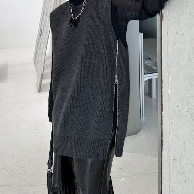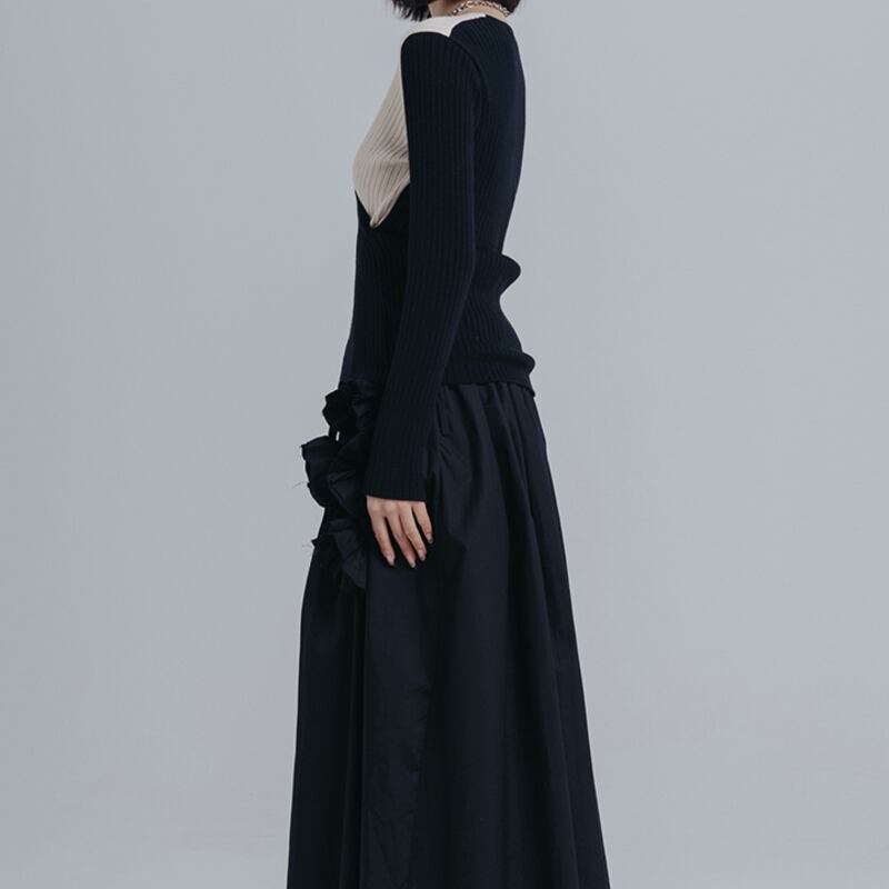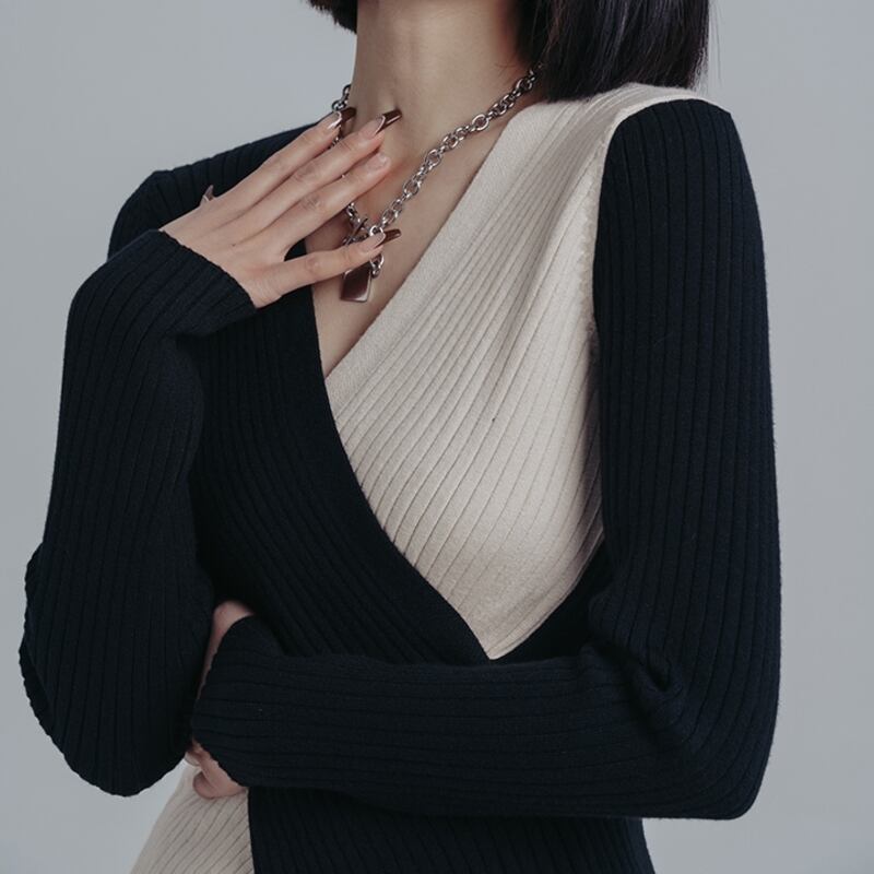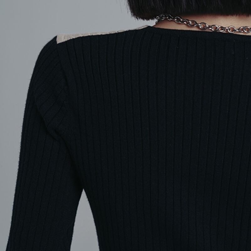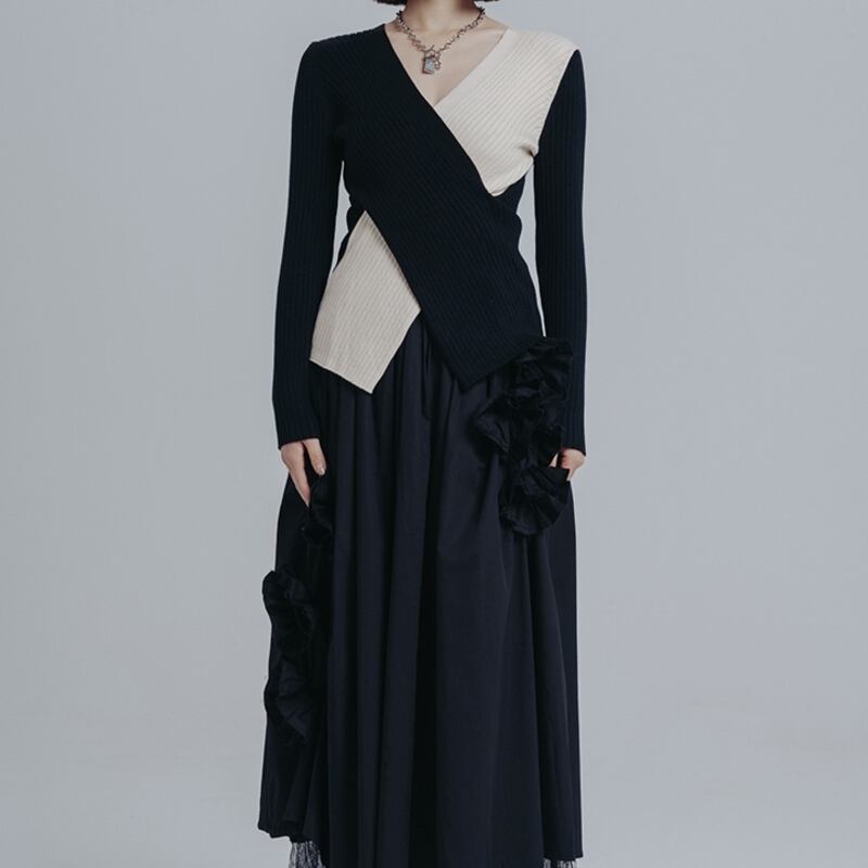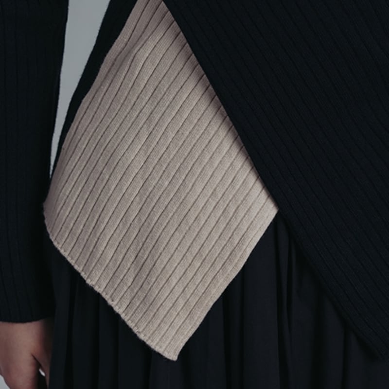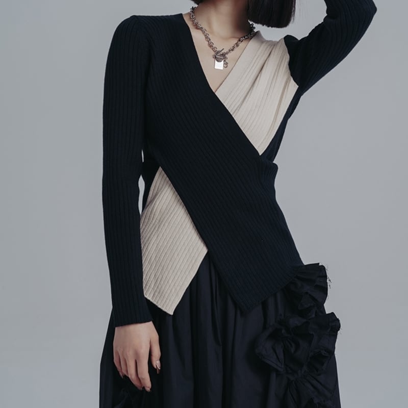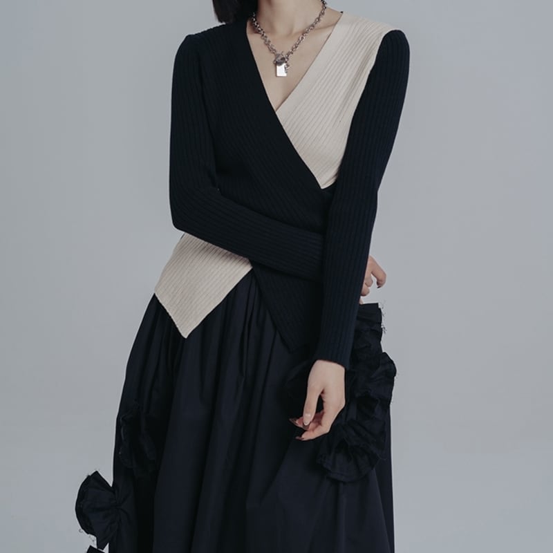 異なるカラーのニットがクロスするデザインは、シンプルながらも目を惹く存在感。