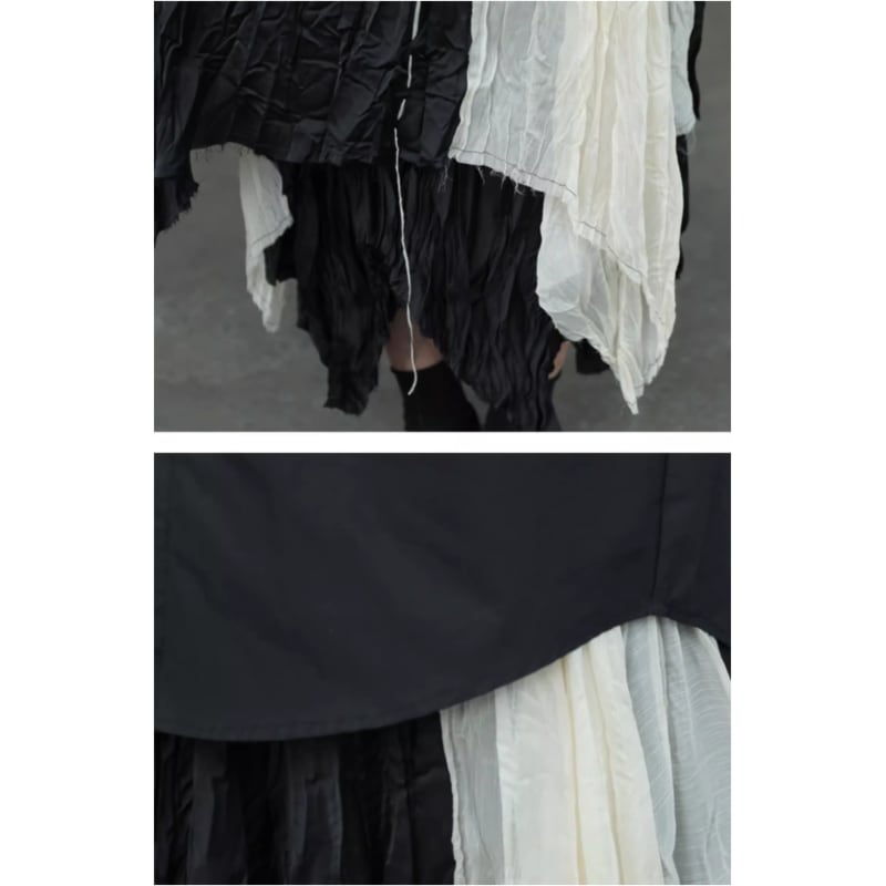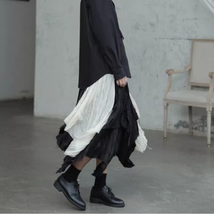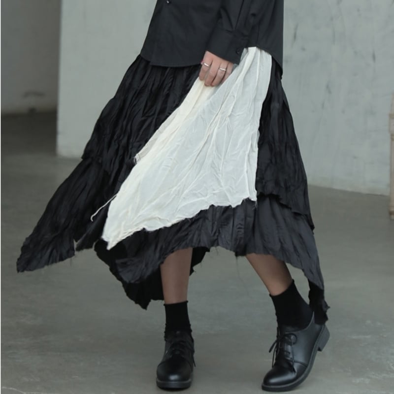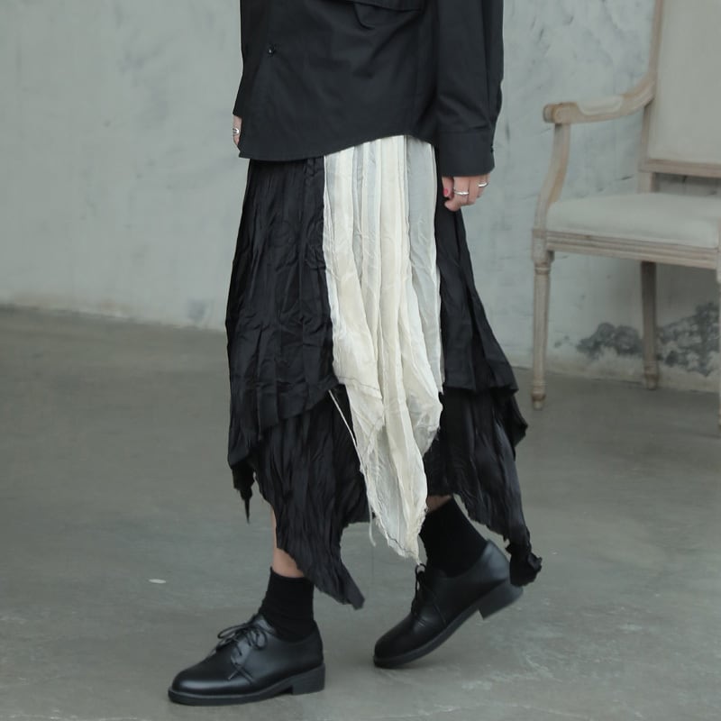 アシンメトリーなデザインが目を惹く、このスカートは一枚でスタイリングの主役級。