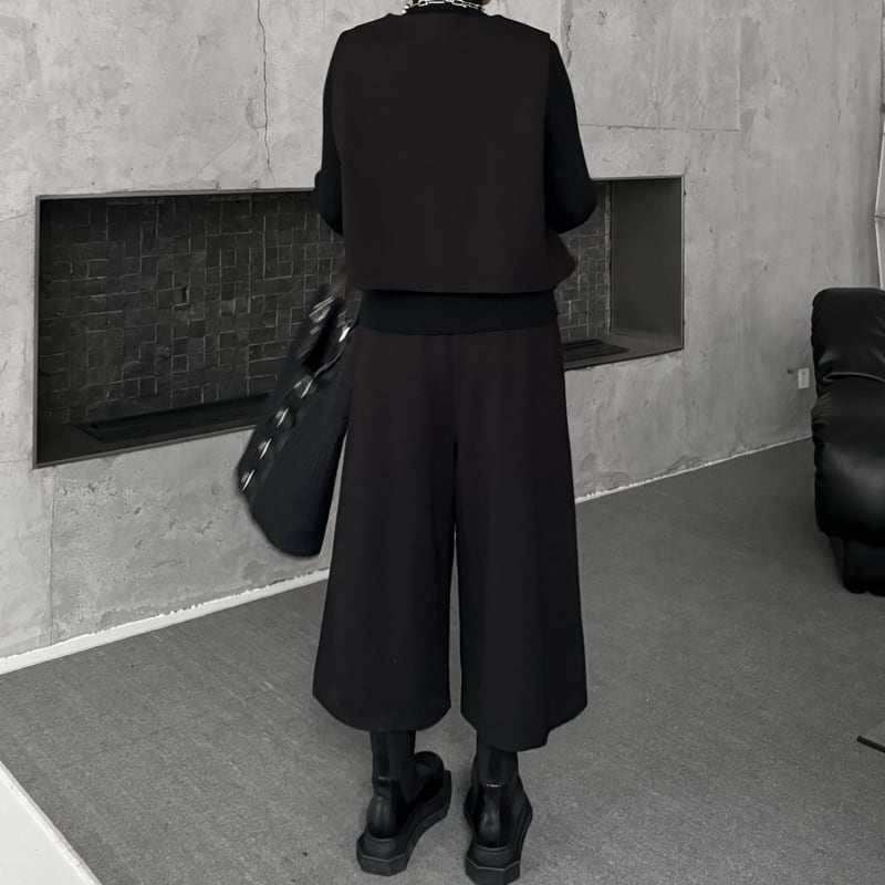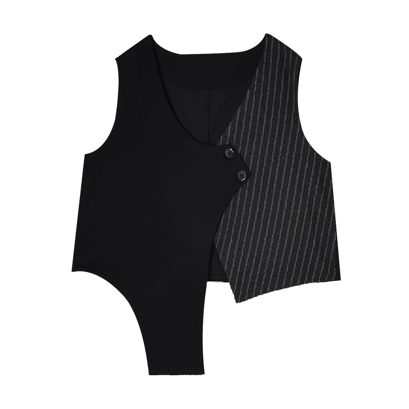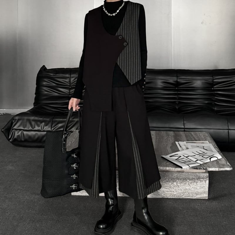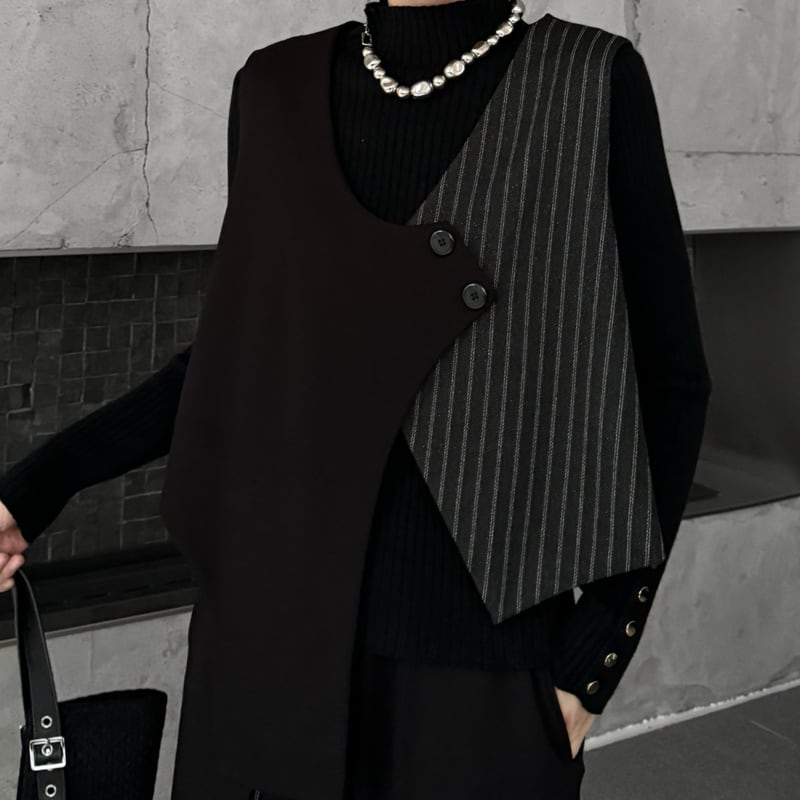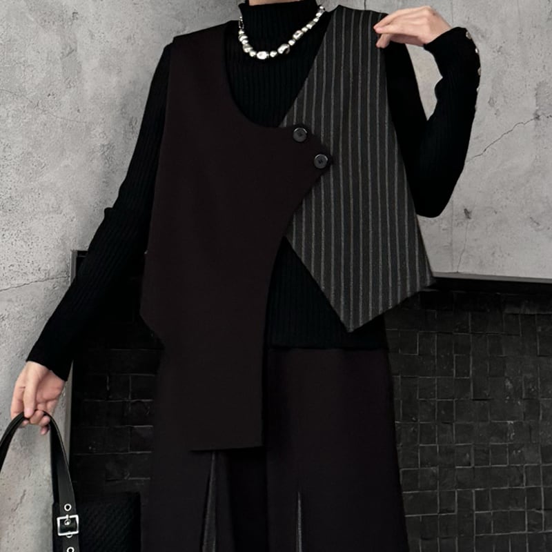 アシンメトリーなデザインが目を引くベストは、コーディネートにエッジを効かせるアイテム。