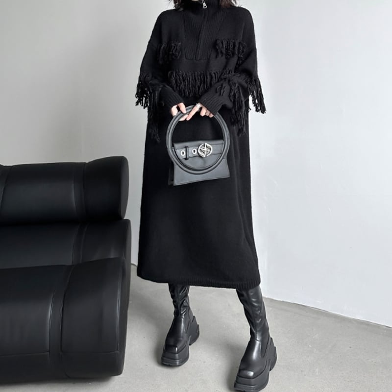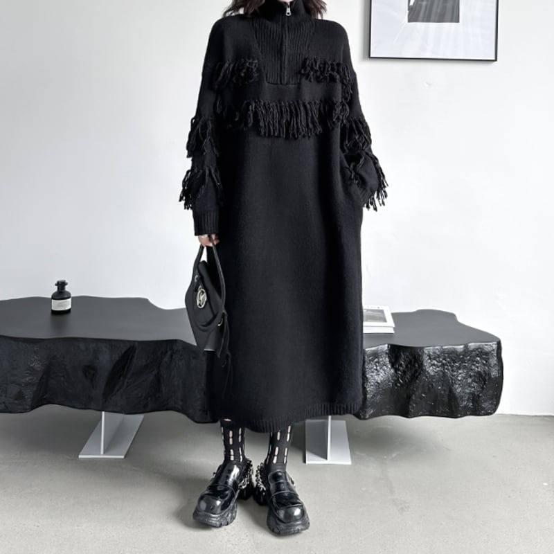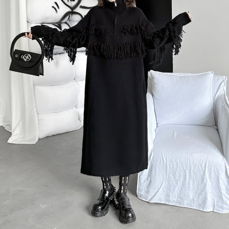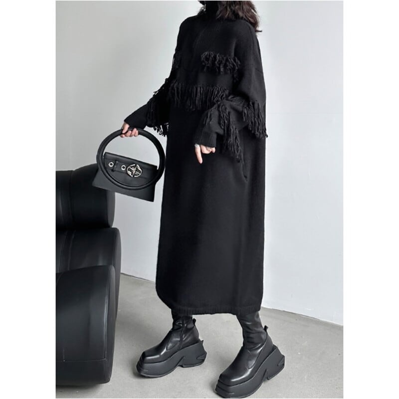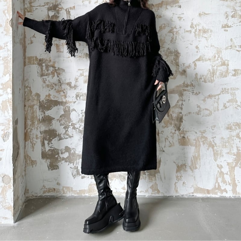 フリンジデザインが目を引く、ロングスリーブニットワンピース。
