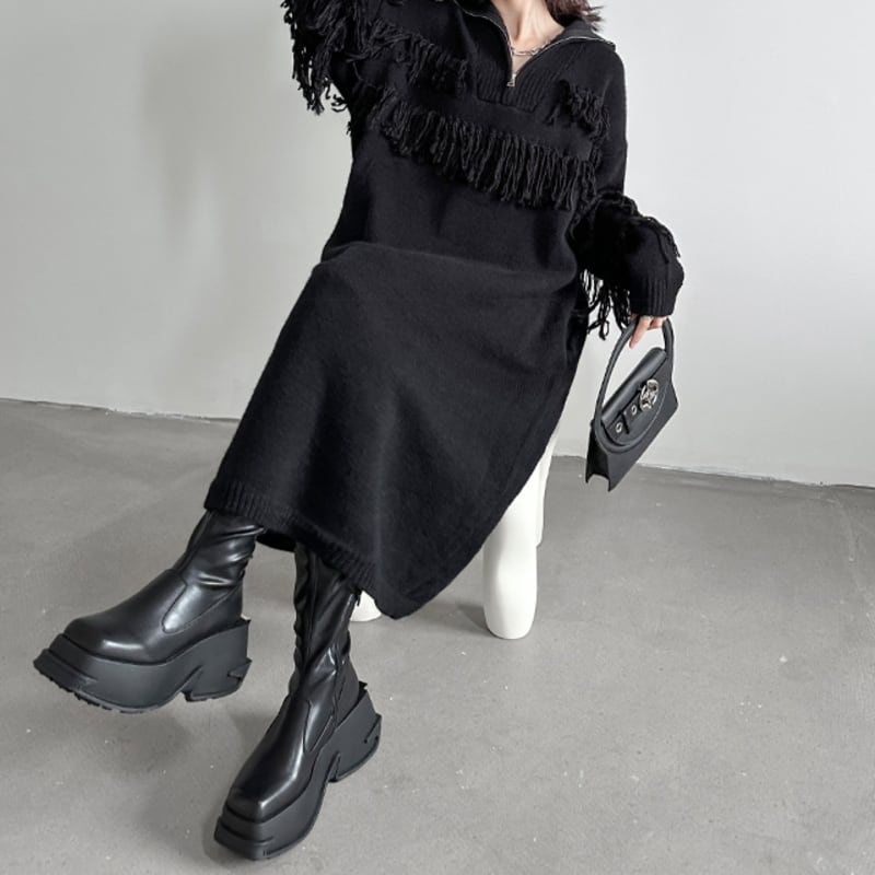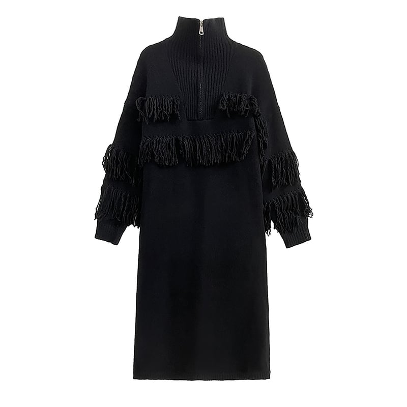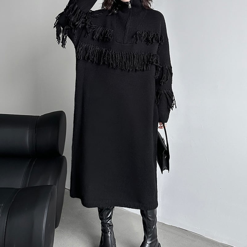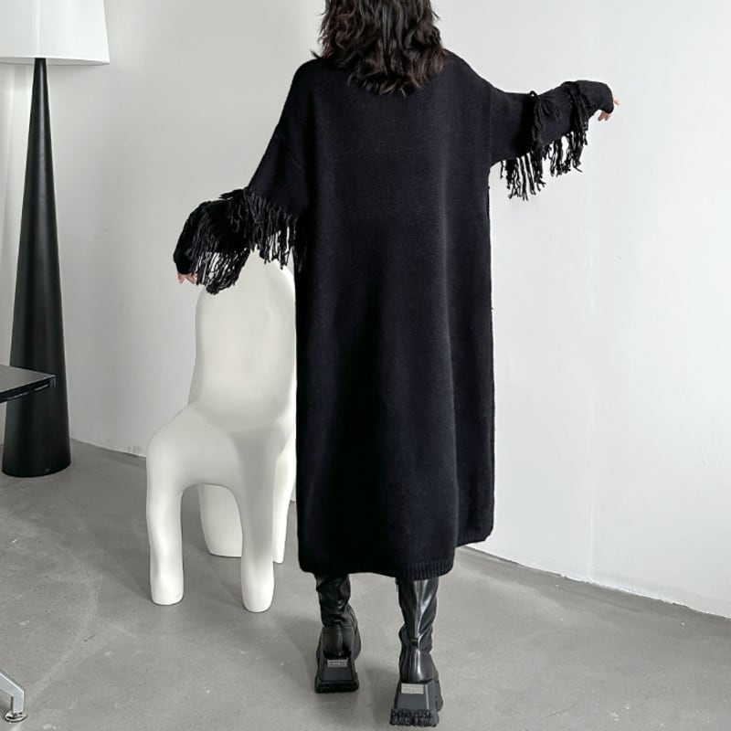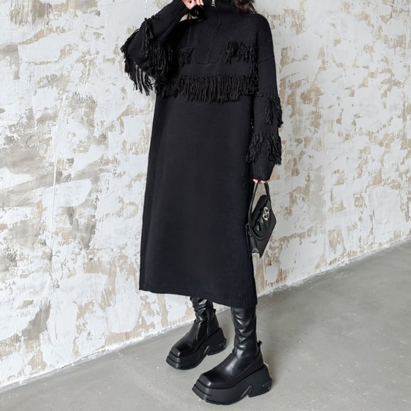 フリンジデザインが目を引く、ロングスリーブニットワンピース。