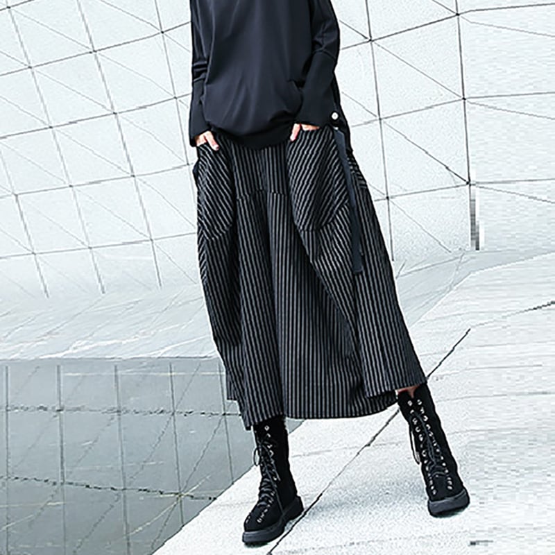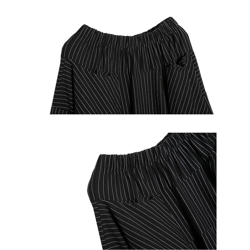 ストライプ柄が目を引く、ギャザーフレアパンツ。