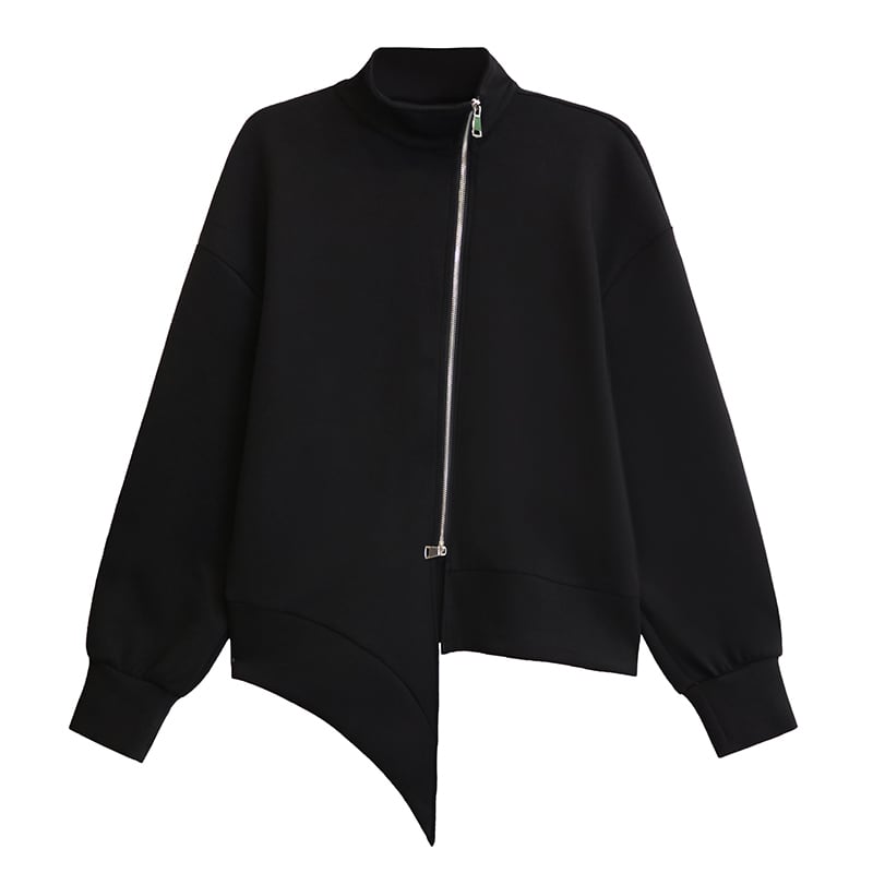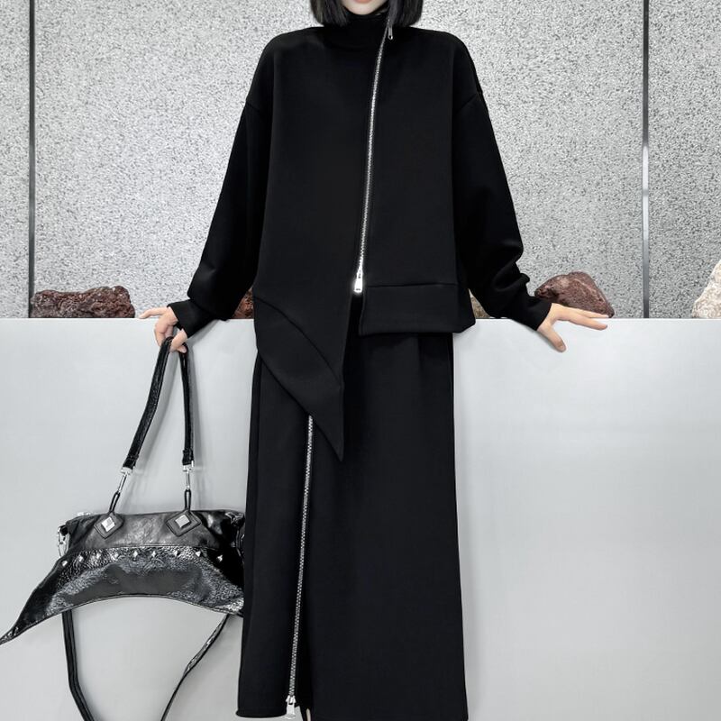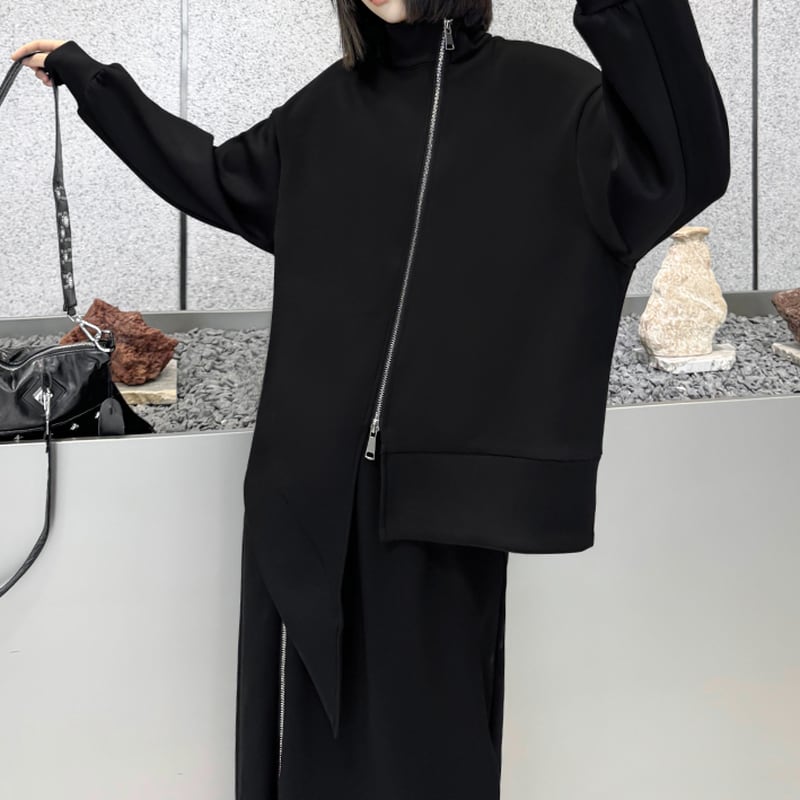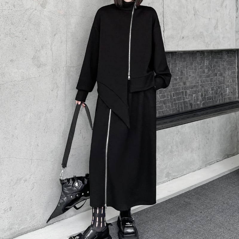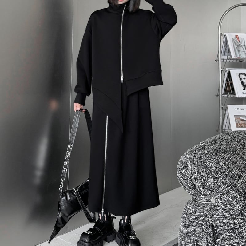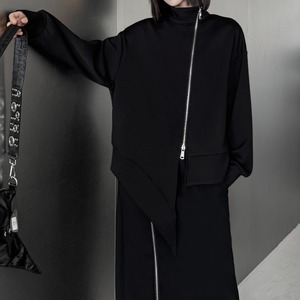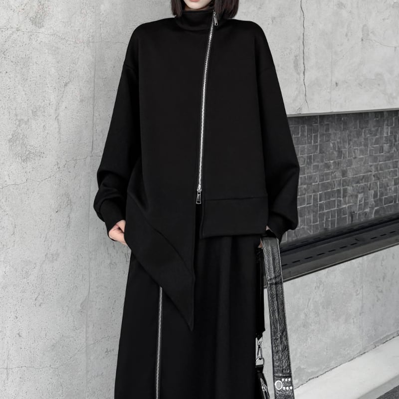 アシンメトリーなヘムラインとモックネックが、シンプルながらも個性を際立たせます。